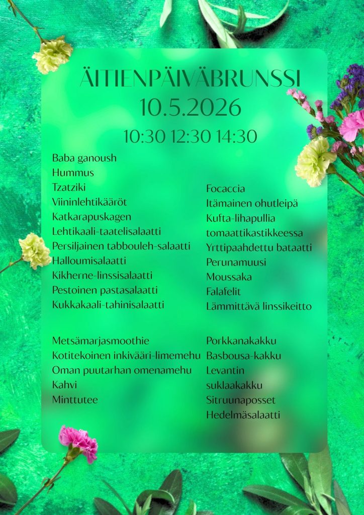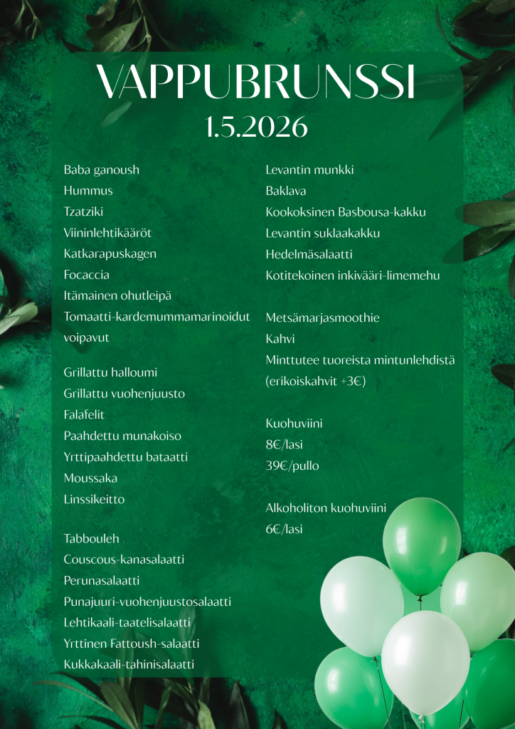 Kattaus sisältää runsaan valikoiman lähi-idän mezejä, erilaisia salaatteja, tuoretta focaccia-leipää, lämpimiä ruokia ja jälkiruokabuffetin. Kotitekoinen inkivääri-limemehu sekä kahvi/tee kuuluvat brunssin hintaan. Lisämaksusta juhlavan brunssihetken voi aloittaa lasillisella mimosaa (7€).