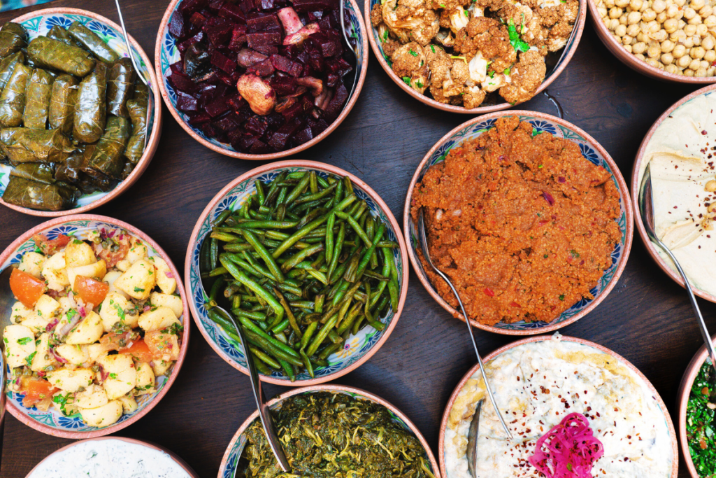 The lunch buffet includes a great variety of Middle Eastern meze, salads, bread and  daily changing vegetarian and non-vegetarian main courses. You can see the main courses on the list below. A freshly baked cinnamon donut with coffee or tea is the perfect finish!