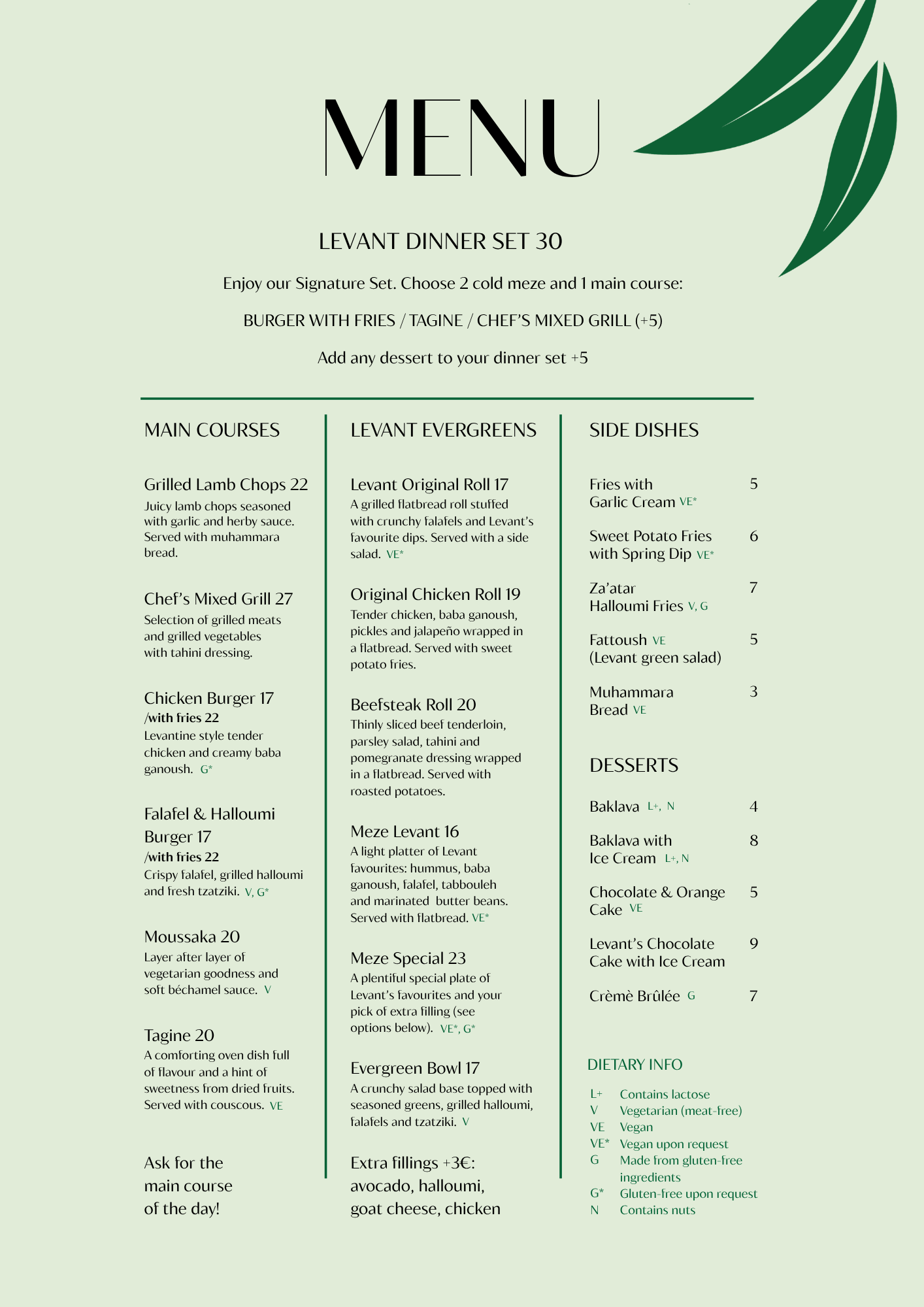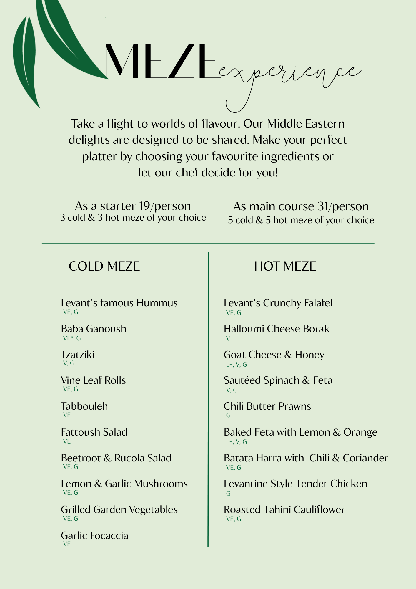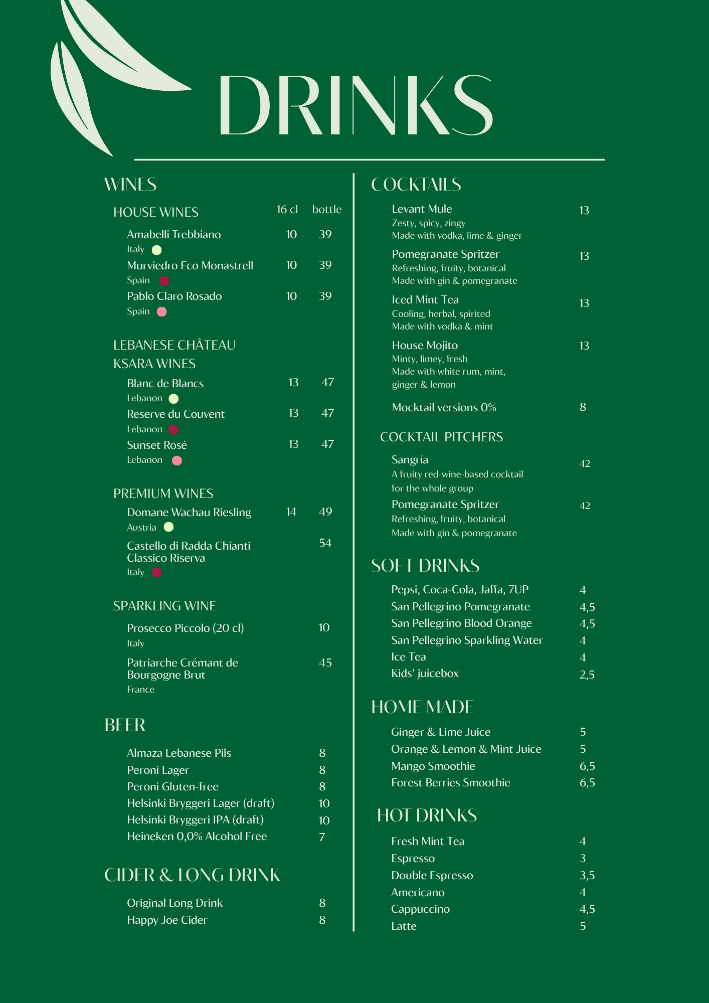 Levant Bulevardilla tarjoilemme myös muista Levanteista tuttujen rakastettujen rulliemme ja salaattiemme lisäksi myös erityistä iltamenua, jolta löydät laajan meze-valikoiman pöytäseurueen kesken jaettavaksi, Bulevardin erikoisuuksia sekä runsaan valikoiman pääruokia sekä viinejä ja cocktaileja.